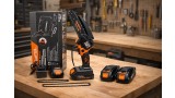 Önszintező, lézerfény rögzíthető, változtatható fényerősségű, mágneses falra szerelhető tartóval, emelhető, és süllyeszthető, valamint forgatható asztallal, távirányítóval, kettő darab akkumulátorral, három részben kihúzható állvánnyal.